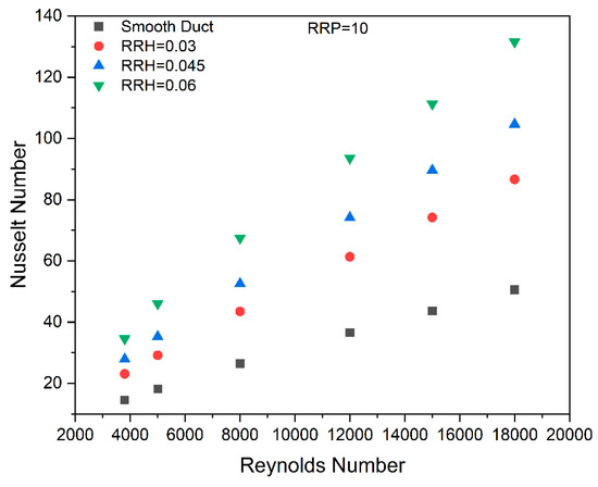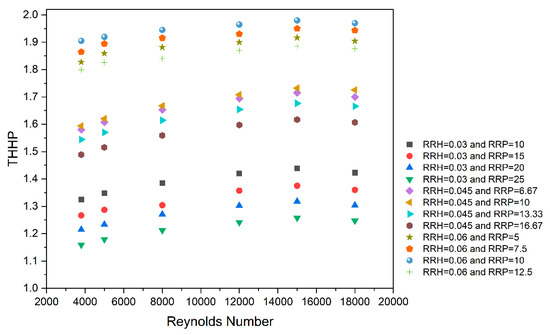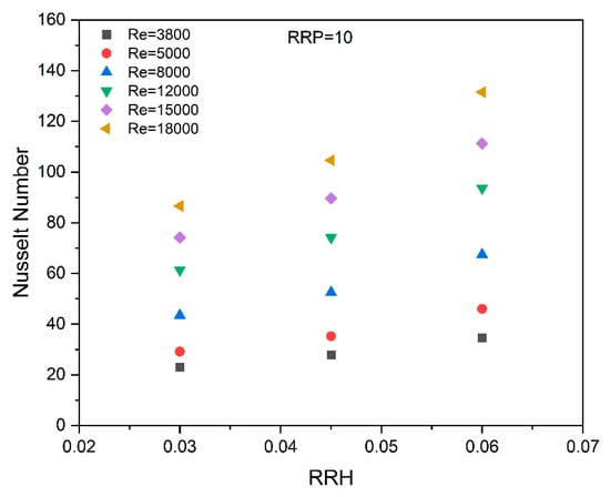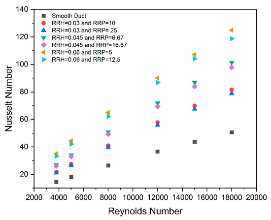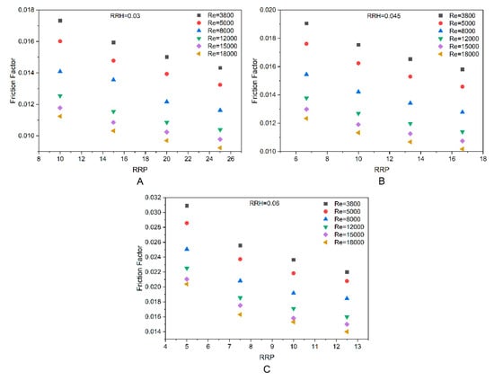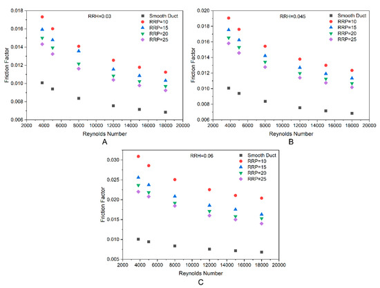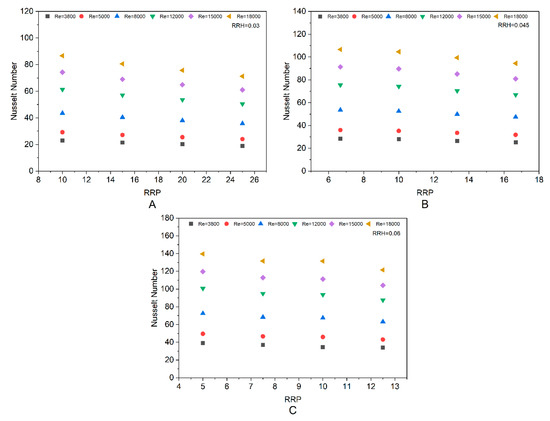 It is worth noting that the Figure 10 data have been re-plotted in Figure 11A–C in order to emphasize the effect of the RRP. It is clearly evident that, for a given RRH, the Nur decreases when the RRP increases and increases when the Re increases in all cases, as expected. The highest possible average Nur value is 139.65, which is shown to be the case when the RRP is 5 and the RRH is 0.06 at a Re of 18,000. As far as the range of parameters being analyzed is concerned, the greatest enhancement in Nur is determined to be 2.76 times that of smooth duct, which corresponds to an RRP of 5 and an RRH of 0.06 at an Re of 18,000.