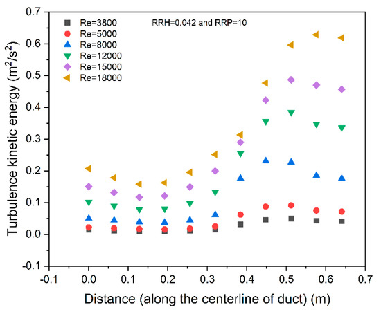Figure 6 displays the scatter plot of the TKE versus the distance along the centerline of the duct. The graph illustrates that the TKE is lowest when the Re is low and rises to its maximum value as the Re increases. This may be explained by the fact that fluid particles move in a random pattern, which, in turn, causes an increase in the TDR and TKE as the Re rises. It is also evident that the TKE is at its lowest level when a short distance away from the inlet, and after that, it begins to rise due to the existence of ribs as the distance from the inlet along the centerline of the duct increases.