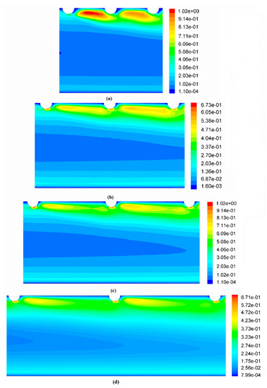 A contour plot of TKE for RRH = 0.045 at Re = 8000 for: (a) RRP = 6.67, (b) RRP = 10, (c) RRP = 13.33 and (d) RRP = 16.67.