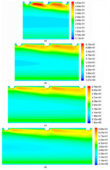 Figure 8 shows the contour plot of turbulence intensity (TI) at different rib pitches at an Re of 8000. The overall TI field as well as the degree of heat transfer can be visualized by looking at the patterns of TI contours around the ribs ahead of and behind the ribs. It is also seen that as the value of rib pitch increases, the value of the TI around the rib begins to decline. As can be seen from this demonstration, an RRP = 6.67 has a significant effect on the TI field, since it is capable of promoting better fluid mixing between the wall and core flow regions, resulting in higher temperature gradients across the heating duct wall. On the other hand, it can be seen that the temperature regions for all four scenarios are similar to one another and are practically spread uniformly throughout the flow, which is a sign of the strong mixing of the fluid flow. As the air passes over the roughened hot surface, heat is exchanged between the air and the surface. Due to convection, the air that is very close to the surface gets heated up very quickly. Because of the roughness of the surface, the primary hot layer interacts with the secondary cold air, and heat is transferred as a result of conduction and convection. Due to this, the temperature of the air at the surface of the duct is higher and decreases as it moves further away from the surface up to one third of the height of the duct.