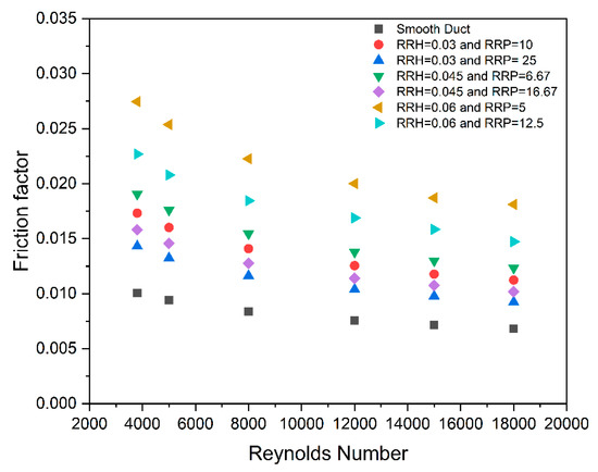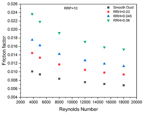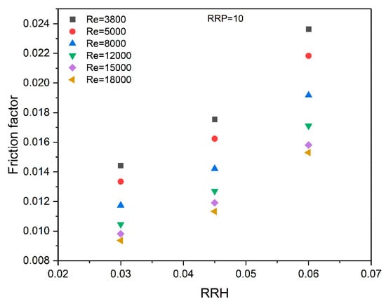 Figure 9 illustrates how the fr varies with the Re for a variety of RRP and RRH values. It has been found that the fr reduces as the Re increases, and the reason for this is due to the suppression of the viscous sub-layer. The generation of vortices that originate from the rib top generates an extra expenditure of energy, which ultimately results in an increased fr.