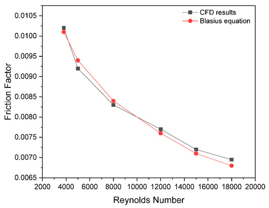In spite of the fact that all turbulence models have advantages and disadvantages, the fact remains that none of them are commonly accepted as being superior in all situations. When selecting a turbulence model, there are a number of considerations to make, including the physics of the flow, the related modelling requirements, the level of accuracy required, and the time available for running the simulation [33,34]. A simulation of smooth ducts was performed in order to obtain the most accurate turbulence model from the various turbulent models that can be implemented in turbulence simulations. The outcomes of the simulation were then compared to the following equation [35].