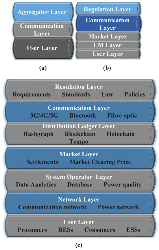 A five-layered TES has been proposed in [17], which contains a communication layer, market layer, regulation layer, energy management layer, and user layer. In the user layer, distributed ledger technology and communucation devices are used by the participants to send their bids and offers, which are used by EMS to start the energy transactions. The energy management layer deals with the operational and economic objectives of the system which ensures dynamic demand–supply balance, reliability, etc. The market layer initiates the energy transactions while considering the energy bids to find the local optimum minimum clearing price. The communication layer is required to facilitate the information exchange using wireless and wired communication platforms. The regulation and governance of TES operation are made by the regulation layer, which is required for transparent energy transactions. The five-layer TES system lacks the network layer, which is needed to include the losses and congestion of transmission and distribution lines; for that, a seven-layer TES has been proposed in [13].
