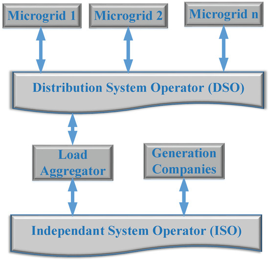 The load aggregator has no control over microgrid players interacting with distributed and wholesale markets and is considered an independent player. An aggregator can assign cost and remunerations among the enrolled consumers and prosumers and thus directly coordinate with the demand side [51,52] with several layers of EMS in the community of enrolled customers. The base layer of EMS measures the generations and consumption in real time. It consists of measurement devices [53]. At the same time, there is a processor in the aggregator in the top layer to calculate price signals and power references. One more layer is responsible for transmitting coordination signals between aggregators to consumers and measured data from users to aggregators. This layer is between the base and the top layer of EMS. In [54], a model to manage the controlled devices that operates on the local market has been presented as an optimization-based aggregator model that allows a small area of energy trading between consumers and producers that brings flexibility in the upstream level requests of the distribution system. The validation of the aggregator based on optimization in real time has been performed for controlled devices.
