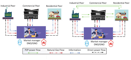 The energy market is Full P2P, Community-based P2P, and Hybrid P2P [18]. Without an intermediary, P2P market players engage directly with each other. The community-based P2P market features a community manager to manage trading operations. In a hybrid P2P market, both P2P and community-based transactions are available (as shown in Figure 5). Bidirectional information and power flow are achievable with high-speed communication and data measurements in TE’s market-clearing system.