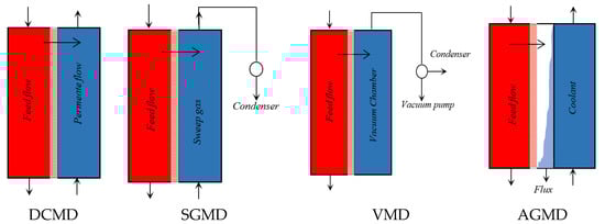 Traditional water treatment methods such as multistage flash (MSF), multi effect distillation (MED), and reverse osmosis (RO) need either high temperature thermal energy or electrical energy for operation. On the other hand, membrane desalination can operate at much lower temperatures and hence in recent years there has been a significant research focus on the development of membrane desalination systems. In this process, a microporous hydrophobic membrane is used to separate liquids from dissolved solids []. The general types of MD system configurations listed below are shown in Figure 1: