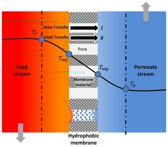 Schematic diagram of the transport mechanism for the direct contact membrane distillation (DCMD) process.