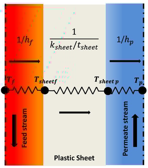 Equations (1) and (2) give convective heat transfer across feed to permeate side []: