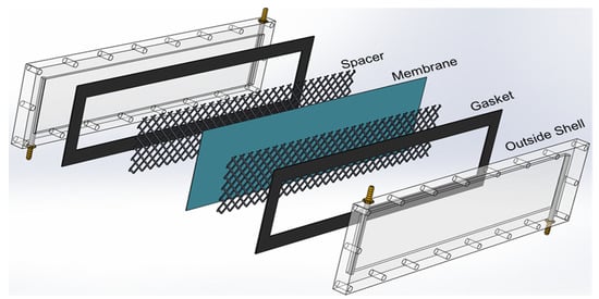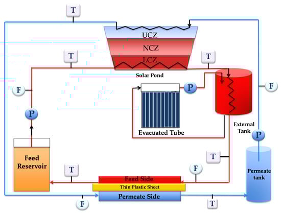 A schematic of the experimental setup for the DCMD module in the Renewable Energy Lab at RMIT University is shown in Figure 5. The solar pond is made of three layers, namely, lower convective zone (LCZ), non-convective zone (NCZ) and upper convective zone (UCZ). The DCMD module contains feed and permeate channels, normally separated by a hydrophobic membrane. For these experiments, a thin plastic sheet (clear polypropylene of 100 µm thickness) replaces the hydrophobic membrane to exclude mass transfer between the feed and permeate channels. Freshwater is circulated through both feed and permeate channels as a heat transfer fluid. A 24 V, self-priming diaphragm pump with a maximum flow rate of 8 L/min is used to pump the water through the system. The feed reservoir tank is filled with 100 L of freshwater, which is pumped to an in-pond heat exchanger in the SGSP to increase the temperature of the feed side fluid. In addition, an evacuated tube solar collector combined with a thermal storage tank (E.T. tank) is used as an auxiliary heat supply. After leaving the SGSP, the freshwater from the feed reservoir was circulated through a heat exchanger in the E.T tank before being fed into the system and returned to the reservoir. In the case of the permeate side, freshwater is transferred from the permeate tank to the top layer of the SGSP to dissipate the heat gained from the feed side fluid. After that, the cooled freshwater passes through the permeate channel in the DCMD module and is then returned to the permeate tank. The 3D structural arrangement of the DCMD module is presented in Figure 6 and shows the channel gaps, spacers, and membrane sheet.