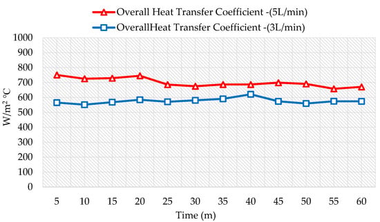 In the case of empty channels, the experiment ran with the same setup conditions shown in Figure 7 with two different flow rates. First, a counter flow arrangement uses 3 L/m on both feed and permeate sides. Then, it uses 5 L/m in both channels, also with counter flow. Figure 7 shows the overall heat transfer coefficient calculated from the experimental results for the two different flow rates. The average overall heat transfer coefficient for the 3 L/m tests was 593 W/m2·°C, and for 5 L/m, it was 724 W/m2·°C. The experimental results show that the overall heat transfer coefficient increases by approximately 18% at steady state when the flow rate increases from 3 to 5 L/min. In Figure 8 and Figure 9, the feed side outlet temperature () is lower than the inlet temperature () because of the occurrence of heat transfer to the permeate side. Correspondingly, the outlet temperature of the permeate side () increases due to heat transfer through the plastic sheet.