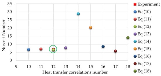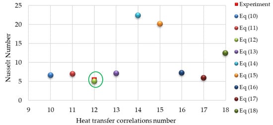 The Reynolds numbers for the two experimental conditions were calculated using Equation (19). They suggested that the flow regime was laminar in both cases. The theoretical Nusselt numbers from heat transfer correlations summarized in Table 1 were calculated for the experimental flow rate conditions presented in Figure 10 and Figure 11. The correlation given by Equation (12) was the most appropriate correlation with a deviation of 10% between the theoretical and the experimental overall heat transfer coefficients.