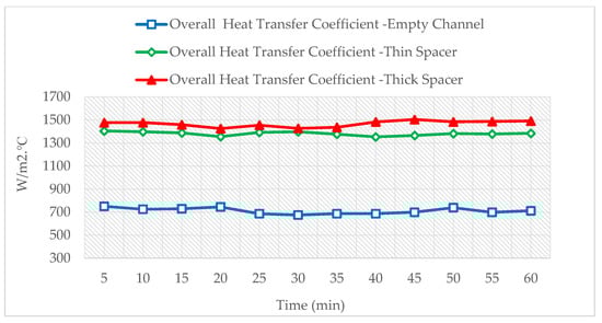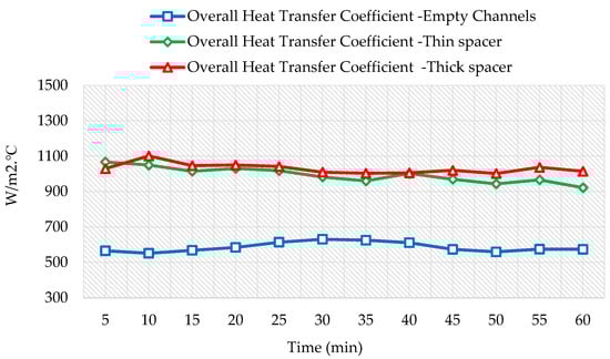 Similar to the empty, spacer-filled channel, these experiments investigated the conductive heat transfer with each spacer geometry using two flow rates: 3 L/min and then 5 L/min. It can be seen in Figure 13 and Figure 14 that the overall heat transfer coefficient in the case of the spacer-filled channels is higher in the case of empty channels for both 3 and 5 L/min. Comparing just the heat transfer coefficients obtained with each of the two kinds of spacer, it can be seen that the thicker (2 mm) spacer produces a higher heat transfer coefficient. The average values for overall heat transfer in the case of the spacer-filled channel with a 1.5 mm thick spacer and flow rates of 3 and 5 L/min, were 949 W/m2·°C and 1379 W/m2·°C, respectively. Furthermore, the average overall heat transfers for a spacer-filled channel with a 2 mm thick spacer and flow rates of 3 L/m and 5 L/m were 1030 W/m2·°C and 1465 W/m2·°C, respectively.