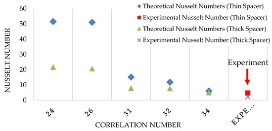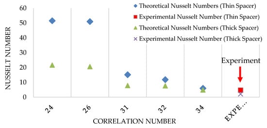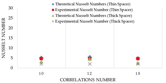 Many researchers have investigated correlations for different kinds of channels; their findings were applied to find the best agreement with the experimental results presented from Figure 7, Figure 8, Figure 9, Figure 10, Figure 11, Figure 12, Figure 13 and Figure 14. A summary of all the experimental and theoretical Nusselt numbers is shown in Figure 15, Figure 16 and Figure 17. Both Phattaranawik and Jiraratananon [] and Kim and Francis [] presented heat transfer correlations for a DCMD module with non-woven spacer-filled channels. Using their correlations, Equations (24) and (26) under the current experimental conditions (1.5 mm and 2 mm spacers; and 3 and 5 L/m flow rates) produced Nusselt number values that differed from experimental results by 90%. Correlations are also given by Equations (31) and (32), which overpredicted the Nusselt number values by 55–72% as compared to experimental results.