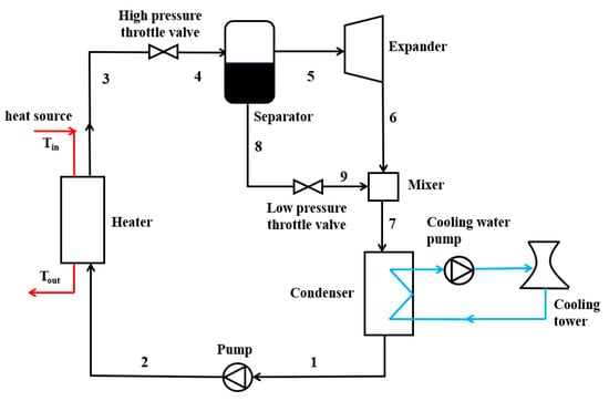 - Wang, Q.; Wu, W.; Li, D.; Wang, J.; He, Z. Thermodynamic analysis and optimization of four organic flash cycle systems for waste heat recovery. Energy Convers. Manag. 2020, 221, 113171. [Google Scholar] [CrossRef]
