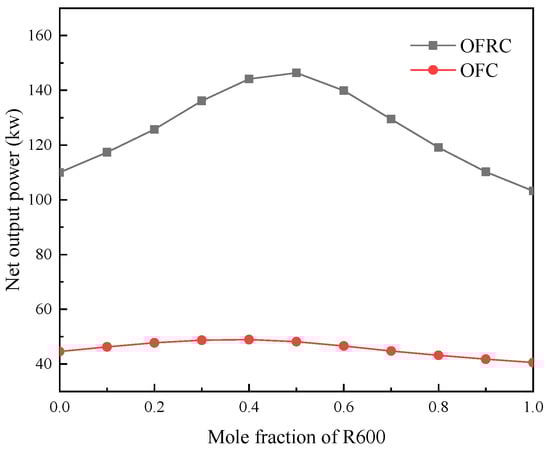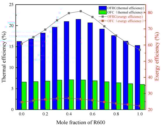 - When the R600 mole composition is between 0 and 1, the maximum net output power, thermal efficiency, and exergy efficiency of the OFRC system are all larger than those of the OFC system. When the R600 mole component is 0.5, the maximum net output power is 146.39 kW, the thermal efficiency is 21.51%, and the exergy efficiency is 80.94% in the OFRC system. By contrast, when the R600 mole component is 0.4, the maximum net output power is 48.91 kW, the thermal efficiency is 7.12%, and the exergy efficiency is 27.05% in the OFC system.