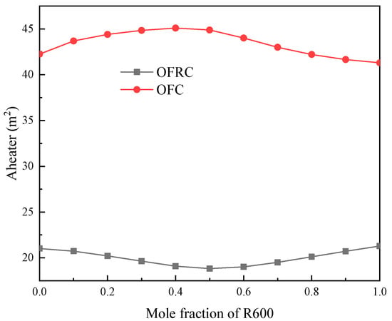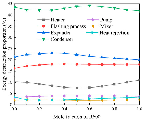 - Dual heaters can effectively reduce exergy destruction in the endothermic process. When the R600 mole component is 0.5, the exergy loss of the heater in the OFRC system is only 7.42% of the total exergetic loss. Among the circulating components, the exergy loss of the condenser accounts for the largest proportion. When the R600 mole component is 0.6, the exergy loss of the condenser in the OFRC system accounts for 44.19%.