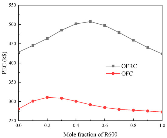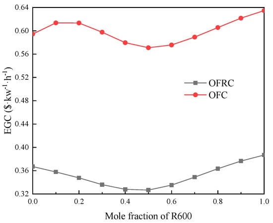 - The OFRC system has a slightly larger PEC than the OFC system owing to its larger mass flow of working fluid. Furthermore, the electricity generation cost of the OFRC system is much lower than that of the OFC system. When the R600 mole composition is 0.5, the EGCs of the OFRC and OFC systems are the smallest at 0.3267 and 0.5709 $·kW−1·h−1, respectively.