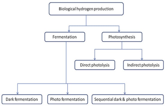 Bio-hydrogen is produced by specialized microbes used in the reactor. There are several ways in which bio-hydrogen is produced, as shown in Figure 1 [19]. Photosynthesis is the basic function of green plants, as they convert light energy into chemical energy that can be used in all cell activities. In the photo-hydrogen production process, the presence of microorganisms such as diatoms, cyanobacteria, and green algae is necessary, because these microorganisms help to convert light energy into H–H bonds [19].