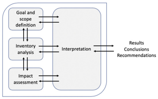 In recent decades, LCA has become an important tool for studying the life-cycle sustainability of any product, especially in research and industry, due to its quantitative nature. It can also help in studying interactions between inputs and outputs and environmental influences [26]. There are many aspects of the ISO 14040 standards for the design and implementation of life-cycle assessment [27]. According to the 14040, 2006, LCA can be divided into four basic stages, as shown in the Figure 2 [26].