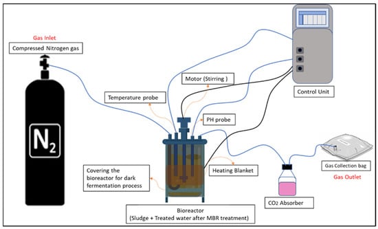 The methodology for producing bio-hydrogen in this study is based on the following process. In this experiment, 500 mL of sludge is mixed with 500 mL of treated effluent in bioreactor. The bioreactor is a BioFlo/CelliGen115 from New Brunswick Company, Oman. Before staring the experiment, it is important to check the connection between the main parts, such as the absorber, gas bag, and the others, with the bioreactor. The check step can be performed using a leak detector. The bioreactor helps in carrying out many functions at the same time. These functions are measuring the value of pH, heating the sample, and bringing the temperature to 37 degrees Celsius. Using the motor for agitation during the fermentation process helps nitrogen gas to flow easily into the sample over about 15 min [37]. The last step is covering the reactor for dark fermentation conditions. The complete details of all these steps are highlighted in Table 3.