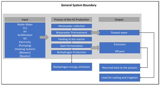 The system boundary and the activities of producing hydrogen from STP are carried out in the scope of the LCA. The overall flow diagram of the general system boundary is shown in the Figure 5. From Figure 5, it is clear from the boundary that there are several processes that were not considered, for example, transport of wastewater to the STP, the collection of influents, or disposal of the waste from the grit chamber.