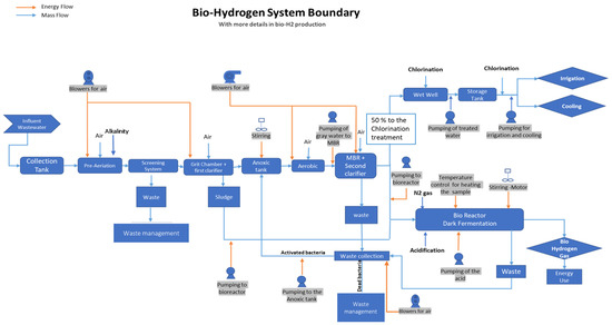 Figure 6 shows the mass- and energy-flow model of the study. To focus on hydrogen production, the process starts with treated wastewater and removal of the waste from the first clarifier by using the blowers and pumps. Then, it moves to the MBR treatment, which uses pumps, blowers, and a stirrer to complete the treatment. After, the bio-hydrogen production process starts in parallel with the chlorination stage. Finally, the produced products are the bio-hydrogen gas and treated water for irrigation and cooling.