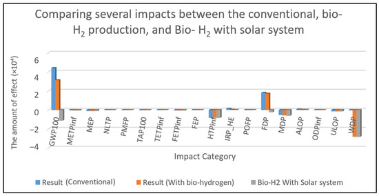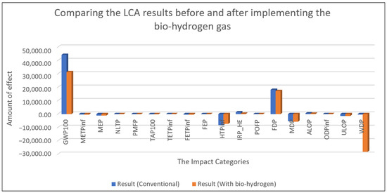 Impact analysis is a way of studying the environmental effects of any process. In bio-hydrogen production from wastewater, several environmental effects were studied, constituting 18 environmental impacts, as shown in Table 7. The impacts were studied for the conventional process to compare them before and after implementing the hydrogen gas production. As reflected in the results, negative values mean a positive effect on the environment and on human health, and positive values are considered to be negative impacts. It should be noted that each impact has a specific unit. As seen here, the conventional process can produce around 4.42 × 104 of kg CO2 Eq. However, this number is decreased with the bio-hydrogen process to around 3.13 × 104 kg CO2 Eq. Another impact which could be explained is that of fossil fuels; in the conventional process, the fuel consumed is approximately 1.81 × 104 kg Oil Eq. Regarding the hydrogen production process, the fossil fuel consumed is less than in the conventional process, at around 1.72 × 104 kg oil Eq.
