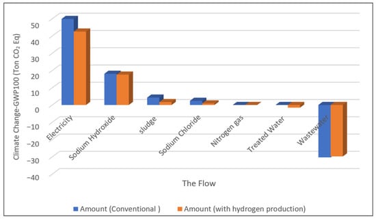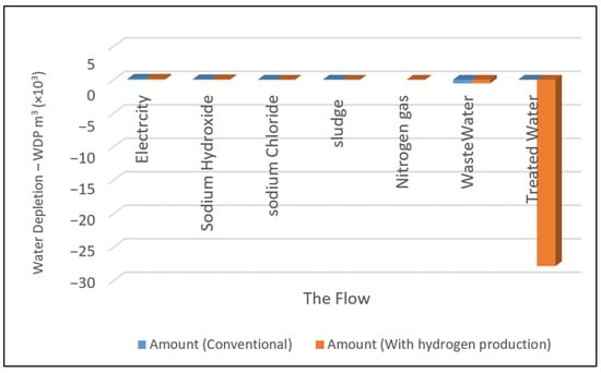 Water depletion shows the amount of the water consumed in the process over the next 100 years. As shown in Table 10 and Figure 10, using electricity can consume around 151 m3 and 152 m3 for the conventional process and for hydrogen gas production, respectively. It is clear that the water sent to the sea in the conventional process consumed around 9.37 × 100 m3 of water, but this amount is significantly decreased with the hydrogen production, to reach around −2.78 × 104 m3; this is because the treated water is reused for cooling, irrigation, and hydrogen production at the same time. Additionally, water depletion from the NaCl and from the sludge is lower in hydrogen production than in the conventional process. This is because 50% of the sludge is used in the hydrogen production and 50% of the Treated Effluent (TE) is not sent to the chlorination stage.