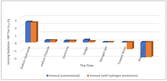 Ionization radiation is considered as a form of energy from disrupting atoms, creating positive and negative ions such as gamma rays, X-rays, and others [43]. Ionizing radiation can affect humans, animals, and plants by passing radioactive particles through the ecosystem. The unit in this impact is uranium 235 Eq, since this radioactive element can be found in many minerals. According to the focused study, all inventory flows that can affect human health by ionizing radiation are converted to the unit of uranium 235. As shown in the Table 9 and Figure 9, sodium hydroxide has a significant impact on human health and the environment, due to the amount of radiation it produces. The conventional process produces about 2.49 × 100 tons U235-Eq radiation, while in the process of producing hydrogen produces about 2.41 × 100 tons U235-Eq. Table 9 and Figure 9 give more details about the ionizing radiation impact.