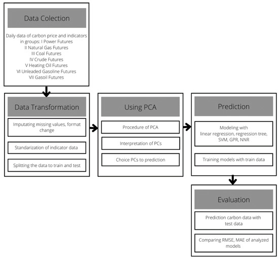 Thus, according to the literature, there are many non-weather factors that affect the formation of EUA prices. Most analyses, however, are concerned with select indicators and individual stock exchange contracts representing selected products. The aim of the study is to jointly analyze a wide range of fuel and energy indicators, which are contracts determining EUA price trends, and to find an EUA price prediction methodology that will be best to forecast their daily course based on the analyzed set of factors. To address multiple gaps, the contribution of our paper is: