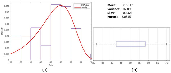 Description of carbon price data set: (a) probability density function, (b) description statistics.