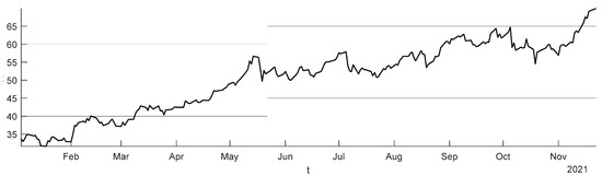 The largest deviations with the model used in the analyzed period were observed around mid-May, early July, mid-August and October (Figure 12). They are caused by the influence of other important factors shaping the EUA levels, which determined the direction of the price course. The unnatural increase in the EUA level in 2021, significantly deviating from the direction of the analyzed determinants, was noticeable in May. At that time, record price levels exceeding 55 EUR/EUA were noted. These increases were mainly caused by the new EU targets for reducing CO2 emissions by 2030. Other important factors were also those of a political nature. Particularly important was the statement of the European Commission official that the decision makers’ top-down stopping of price increases on the EU ETS market was unlikely, which was feared. These concerns resulted from the specific nature of regulating the CO2 emissions market, which is determined by the EU ETS Directive. Under Article 29a, it is possible to stabilize and regulate EUA prices by placing additional EUAs on the market, but only if several conditions are met. One of those conditions is price increases persisting over a period of over six consecutive months, during which the average EUAs price would over three times exceeded the average for the past two years. This mechanism must not jeopardize the market fundamentals. It was only on May 13 that a correction of the growing EUA trend, caused by a change in market sentiment, was recorded. It resulted in an almost 4% drop in the price level with a trading volume much higher than usual. The reasons for the sudden drop can be found in the general fear of inflation in the US and the declines that occurred in the European markets. In turn, on May 14, after the markets rebounded from inflationary shocks and rising gas prices, the levels of CO2 emission prices rose again, reaching almost EUR 57/EUA.
