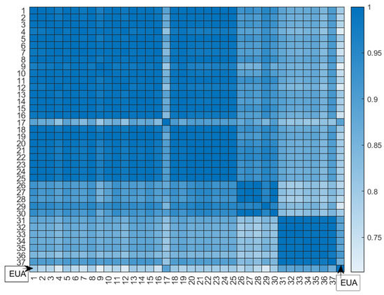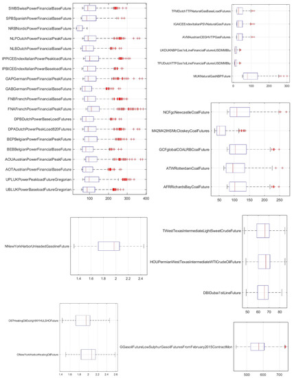 In this paper, we also consider 37 indicators that may affect the carbon price. The indicators are analyzed in groups for individual products (Table 1). Figure 4 shows descriptive statistics charts for the analyzed indicators. Figure 5 presents a matrix of correlation coefficients. The correlation among all indicators and EUA is higher than 0.7. A higher correlation (>0.9) can be seen between the indicators in the same product group. A high correlation is also observed between the prices of power and natural gas and the prices of crude, heating oil, unleaded gasoline and gasoil. The exception is the correlation between the x17 contract (‘NRBNordicPowerFinancialBaseFuture’) and other prices of power and natural gas. From the group of contracts for the supply of electricity, this contract shows the lowest convergence. This is because producers from Nordic countries are not as dependent on fossil fuels as elsewhere in Europe. Electricity in the Nordic region is generated largely from renewable resources (mainly hydro and wind power).