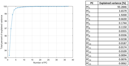 We sort the eigenvectors according to the descending order of their eigenvalues, then we sort the principal components in descending order by their variance (transferred information). To identify the input variables , those PCs are selected for which the considered cumulative variance is greater than the assumed value of 95–99%. Thus, where and .