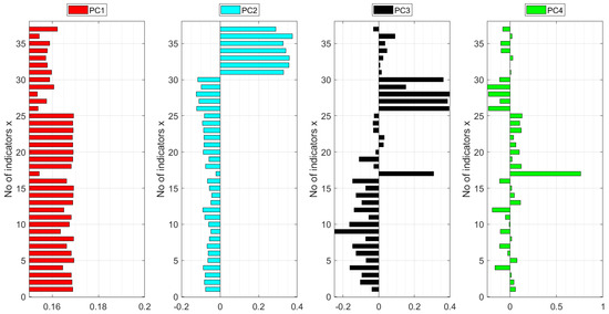 Figure 7 graphically presents the coefficients (contents) v in formula (4). In the interpretation of the results obtained by use of the PCA, the meaning of each primary indicators in a PC can be determined. The higher the modulus value of an element in the eigenvector, the more important this variable for a PC is.