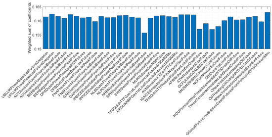 In PC1, all the coefficients of indicators are positive and not very differentiated; thus, all parameters are positively correlated with the main component that most describes the total variance of the analyzed data. However, these indicators can be identified as having the greatest impact on over 93% of the total variance for the model. These are x1–x16 x18–x25, thus, the products of groups I and II (I Power Futures and II Natural gas Futures).