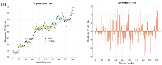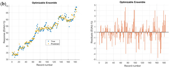 Comparison of results of day-ahead forecast of carbon price using (a) optimizable medium tree and (b) optimizable ensemble tree (for training data).