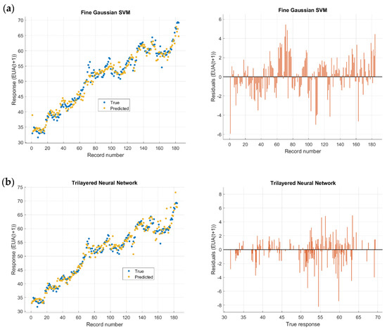 In this section, we also used a neural network model. From among the many examined structures, we present the results of analyses for examples with two and three network layers with the ReLu activation function (Table 3). Neural network of layer size: 11/11/11 turned out to be a better prediction tool compared to the Fine Gaussian SVM because, despite similar errors for the training data, neural networks can better generalize and the RMSE and MAE errors are slightly smaller. A visual comparison of the results can be found in Figure 10.