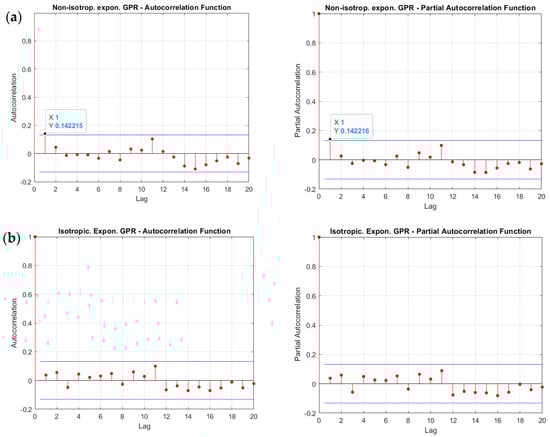 Residuals autocorrelation and partial autocorrelation functions for: (a) Non-isotropic exponential GPR, (b) Isotropic exponential GPR.