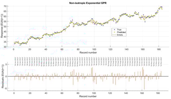 The comparison of the Non-isotropic Exponential GPR model response and the true response for the training data (with cross-validation with 5 folds) is presented in Figure 12. On average, the observed carbon price values deviate from the forecasts by EUR 1.305/t CO2 in the train data, which is just over 2.5% of the average carbon price in 2021. For testing data, the average observed carbon price values deviate from the forecasts by EUR 1.339/t CO2 (slightly above 2.6% of the average carbon price). The variance of the deviation of the predicted values from the real ones for the test data is 1.78, which proves a relatively small dispersion of deviations. The mean absolute percentage error (MAPE) for the train data is 2.16%. Thus, the price prediction for the proposed GPR model can be considered very accurate. Figure 13 and Figure 14 show the dependence of the deviations of the actual carbon price from the forecast value in relation to true and predicted values (for train and test data).