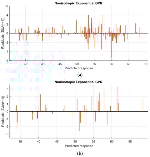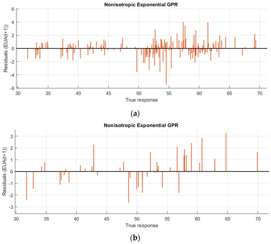 Dependence between residuals and predicted responses, using Non-isotropic Exponential GPR for (a) train data, (b) test data.