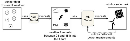 The following section details the challenges associated with day-ahead power forecasts. We include a description of the overall process for generating power forecasts for a wind or PV park. Figure 5 summarizes this process. Due to the weather dependency of renewable power plants, we require weather predictions from so-called NWP models. The NWP model receives input from sensors that approximate the current weather situation. Based on the latest sensory data, a so-called model run is calculated. This model is ran, e.g., at 0.00 a.m. Due to the complex and manifold stochastic differential equations involved in predicting the weather, such a model run typically requires about six hours. Afterward, the NWP provides forecasts, e.g., up to 72 h into the future. In our case, we are interested in so-called day-ahead power forecasts based on weather forecasts between 24 and 47 h into the future. Based on these weather forecasts and historical power measurements, we can train the ML model to predict the expected power generation for day-ahead forecasting problems.