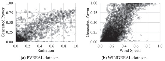 However, due to the dependency of renewable power forecasts on weather forecasts as input features, substantial uncertainty is associated with these forecasts making it a challenging problem. At the same time, weather forecasts are valid for larger grid sizes, e.g., three kilometers, and a mismatch between these grids and the location of a wind or PV causes additional uncertainty in the power forecasts [25]. These mismatches and the non-linearity of the forecasting problem are depicted in Figure 6. We can observe mismatches between the predicted wind speed (or radiation) and historical power measurements. For instance, we can observe (outliers) where a large amount of power is generated for low values of those features. These mismatches are also shown in the time series plots in Figure 7. This observation indicates that the weather forecasts were incorrect. While the scatter plot indicates a more linear and straightforward forecasting problem for PV, we can also observe a stronger correlation in the time series than for wind.