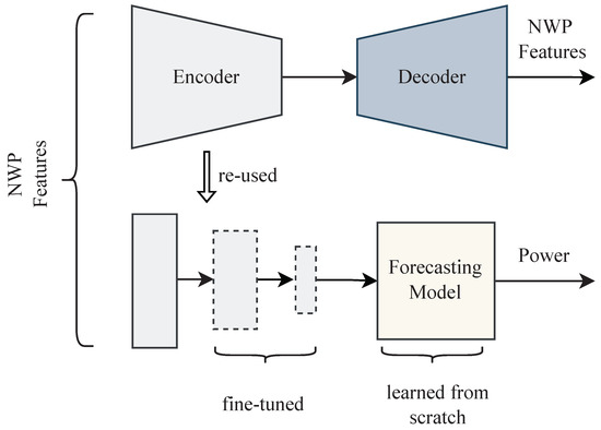In our experiments, we initially trained an autoencoder to reconstruct the NWP features and learn the latent features of the weather. Afterward, the encoder was fine-tuned with a forecasting model to forecast the day-ahead power.