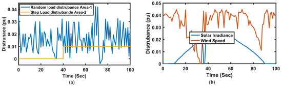 In this section, a random load pattern is generated for area-1 and is presented in Figure 8a. Further, to reflect a more practical approach in this scenario, both renewable energy sources are taken as variable power generating sources and verified under solar and wind data, as presented in Figure 8 [42]. For further verification, the result obtained from the proposed controller is analyzed and presented below. Figure 8a,b demonstrate the solar irradiance and wind speed. Figure 8c,d demonstrate the comparative dynamic response of frequency deviation in area-1 and area-2, respectively; whereas, Figure 8e denotes the comparative dynamic response of tie-line power deviation. It can be clearly analyzed from Figure 8, for this scenario too, that the proposed controller minimizes the errors as compared to other controllers and demonstrates the settling time, undershoot, and overshoot of the frequency response for area-1 and area-2, and that the tie-line power deviation is much less compared to another compared controller. It can be further seen from Figure 8 that the obtained results for these performance indicators are best from the BLO-based PI–PDF controller. Hence, the proposed control strategies perform best and suppress the frequency oscillation more rapidly with much less overshoot and undershoots.