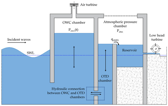 The hybrid O2WC-WEC concept basically consists of two chambers, each containing an inner water column which oscillates under the action of the incident wave motion (Figure 1). The first chamber (referred to, hereafter, as the OWC chamber) closely resembles a conventional OWC device: the air pressure difference between the inner chamber and the exterior induces an airflow, which activates an air turbine constituting the PTO system. In the O2WC, the OWC chamber is hydraulically connected to the second chamber (referred to, hereafter, as the OTD chamber) through a submerged aperture located on its back wall. The internal free surface in the OTD chamber is constantly subjected to atmospheric pressure (i.e., the chamber has no roof). When the level of the free surface in the OTD chamber exceeds the level of its back wall, overtopping water flows are accumulated into a reservoir, located above the SWL. The potential energy of the water stored in the reservoir can be converted by using a low-head hydraulic turbine.