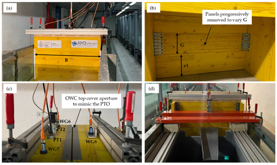 The submerged opening connecting the OWC and the OTD chambers extends along the full width of the model, to preserve the two-dimensional geometry. The submerged opening is located at a fixed distance from the bottom, z1 = 0.14 m (Figure 2b) and has a variable size (G = 0–12 cm, with a step of 2 cm). To vary the size of the opening, the rear wall of the OWC chamber was manufactured as the union of several panels (Figure 2b), having a height of 2 cm each, screwed to the side walls of the model with L-shaped brackets in order to be easily removed during the tests. The joints of the panels have been sealed with silicone to guarantee watertight integrity. When varying G, panels were progressively removed starting from the lower ones, i.e., an increase of G also means decreasing the depth at which the aperture is located.