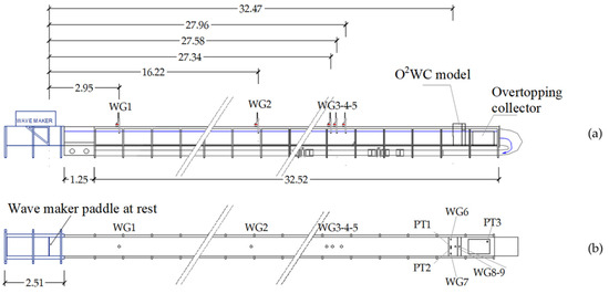 Position of the O2WC model and sensors installed the wave-current flume: longitudinal cross-section view (a) and top view (b). WG: ultrasonic wave gauge; PT: pressure transducer.