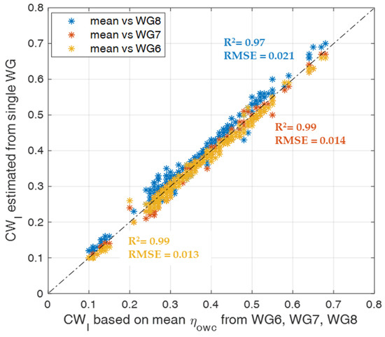 It is worth pointing out a specific methodological aspect of the laboratory tests performed in the present work to assess CWI. As mentioned in Section 2.4, redundant measurements of the free surface oscillation were taken to monitor the validity of the assumption of flat heave motion of the inner water surface inside the OWC chamber. As a preliminary way to quantify the possible impact of deviations from such a hypothesis on the quantity of interest, the values of CWI obtained based on the water level measurements ηowc recorded at different WGs were compared to that obtained using the average of ηowc measurements from WG6, WG7 and WG8 (Figure 4).