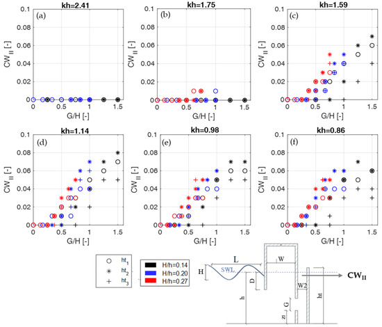 As far as the capture width ratio of the overtopping component of the device, CWII (Figure 6), is concerned, maximum values of about 0.08 are obtained in the tested range of conditions. The maximum CWII corresponds to the O2WC configuration having G/H = 1.5, intermediate overtopping threshold height ht2 and relative water depth kh = 1.14 (Figure 6d). It is worth noting that the higher kh-values tested (kh = 2.41 and kh = 1.75, Figure 6a,b) are associated with null CWII, since as aforementioned in such conditions the submerged connection between the two chambers is located too deep underwater for transmitting relevant wave-induced effects to the overtopping chamber.